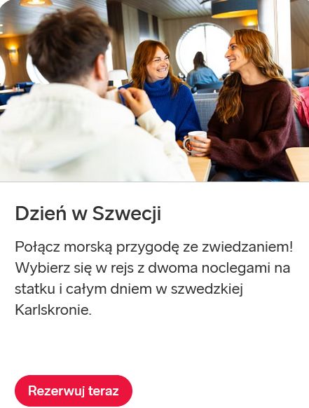Kiedy klient prosi nas o przygotowanie oferty na wyjazd krótki, ale atrakcyjny, niezmiennie proponujemy mu:Przygodę zaczynamy w Gdyni, skąd wieczorem wypływamy w rejs komfortowym promem Stena Line. Na promie do naszej dyspozycji są eleganckie restauracje i bogato wyposażone sklepy.