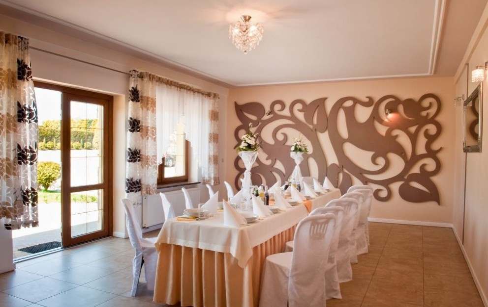 Posiada własny parking dla gości, plac zabaw dla dzieci, ogród oraz pokoje gościnne dla 20 osób.